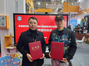 学院主动服务国家发展与地方经济文化建设。与景德镇出淼文化发展有限公司开展产教合作,围绕地方特色传统文化与乡村文化传播打造了“V观视界”“青农社区”“有个机会”三个以乡村文化线上传播为主要内容的大学生创新创业项。“V观视界”获2024年度挑战杯江西省铜奖、第六届中国创翼创新创业大赛景德镇赛区优秀项目奖。青年乡创品牌“有个机会”项目通过短视频的制作与发布完成了33条视频拍摄与发布,抖音账号总播放量超100万人次,收到较好的经济与社会效益。此外,学院受邀参加河南省平顶山市郏县新新青年创新发展学院成立揭牌仪式并在青年乡村创新发展沙龙环节交流经验。为景德镇陶博城首届国际精准采购节、“2024景德镇陶瓷跨国采购对接会”等提供外贸活动志愿服务。学院还承担了江西省协同提质行动计划项目,选派吴俊芳副教授前往浮梁县体育运动学校挂职锻炼,深度参与该校的人才培养及教学研究工作。
