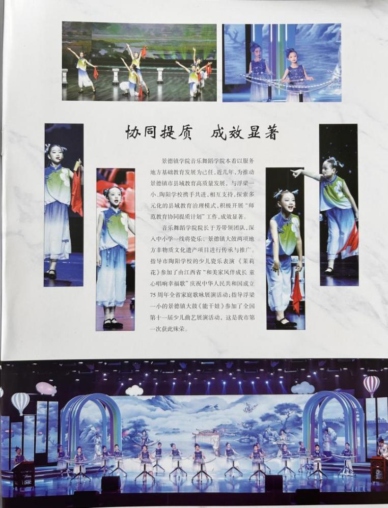 音乐舞蹈学院以“请进来、送出去”模式,一方面通过激励专业教师挂职于中小学指导帮助合唱、瓷乐、景德镇大鼓等社团活动的方式,将自己的专业知识和学科能力“送出去”,发挥资源互补优势,县域协同提质工作取得了显著成效。