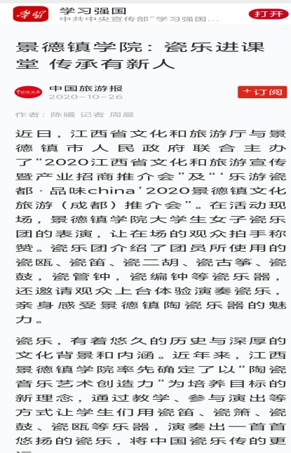 “罄音”瓷乐团被中国旅游报刊登题为《米兰milan官方网站:瓷乐进课堂 传承有新人》专题报道并被“学习强国”学习平台予以转载