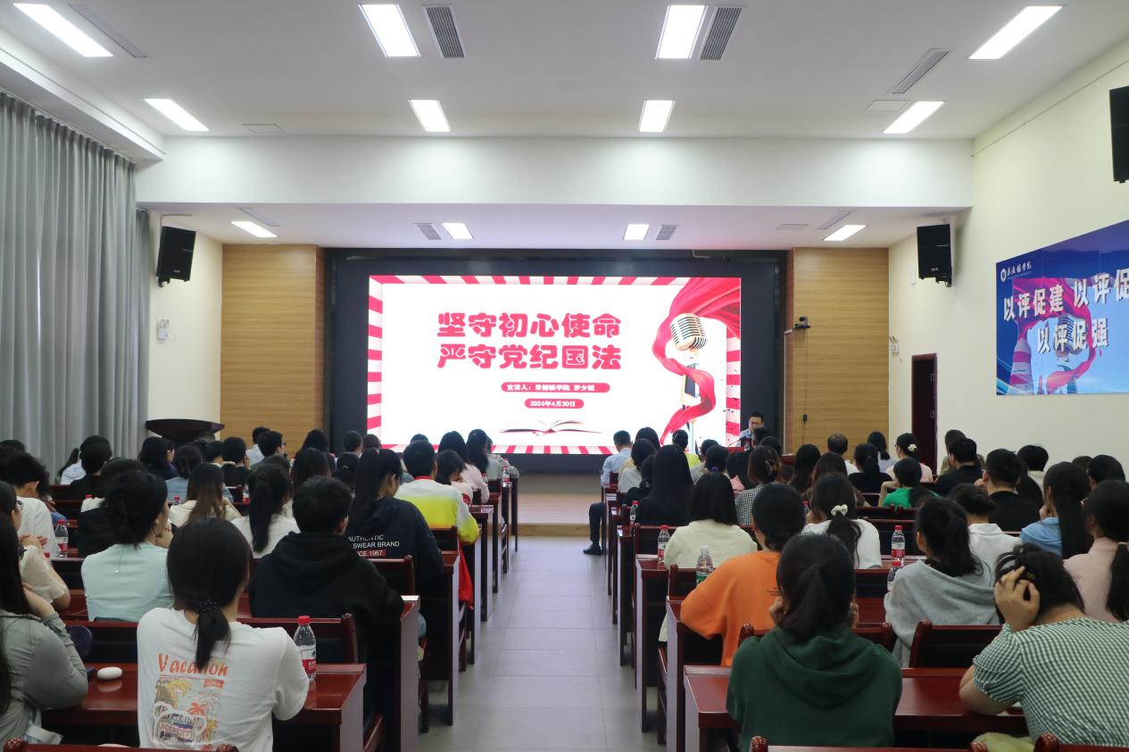 (本网讯:文|童玉婷/图|舒曼亮)为进一步推进全面从严治党向纵深发展,引导师生深入学习领会新修订的《中国共产党纪律处分条例》,让党员师生及入党积极分子明纪法、守底线,4月30日上午,校党委委员、纪委书记罗少韬在第一报告厅为外国语学院师生讲授“坚守初心使命,严守党纪国法”主题党课。