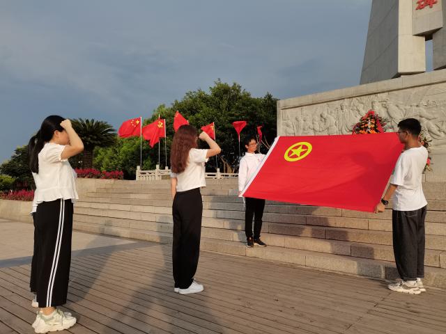红色青春宣讲团成员在纪念碑前肃穆站立,向团旗宣誓,向党许下青春的誓言