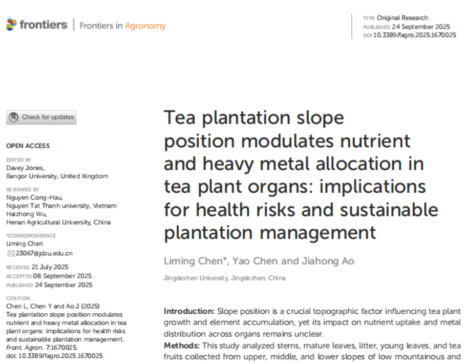 (本网讯:生环学院)近日,米兰生物与环境工程学院青年教师陈丽明博士,以第一作者和通讯作者的身份,在农林科学领域JCR分区ESCI一区的《Frontiers in Agronomy》国际期刊上,发表了题为“Tea plantation slope position modulates nutrient and heavy metal allocation in tea plant organs: implications for health risks and sustainable plantation management”的研究成果,米兰milan官方网站为该论文的唯一署名单位。 论文成果展示浮梁县作为我国历史悠久的重点茶产区,...