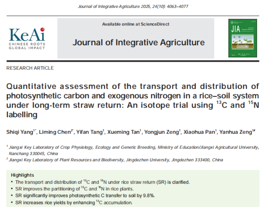 (本网讯:生环学院)近日,米兰生物与环境工程学院青年教师陈丽明博士,与江西农业大学研究团队合作,在农林科学领域国际权威期刊《Journal of Integrative Agriculture》上发表题为“Quantitative assessment of the transport and distribution of photosynthetic carbon and exogenous nitrogen in a rice–soil system under long-term straw return: An isotope trial using 13C and 15N labelling”的研究成果。陈丽明为论文共同第一作者,...