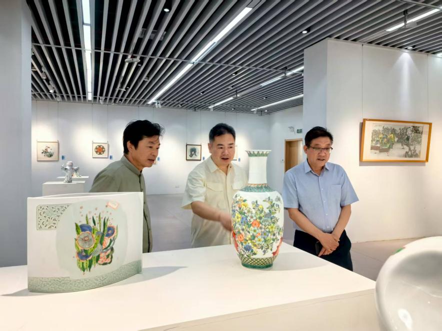 在方漫的陪同下,双方参观了美术馆一楼国家艺术基金项目展、三楼的书法作品展和陶瓷美术与设计艺术学院一楼师生作品展,并在行政楼318会议室召开了座谈会。