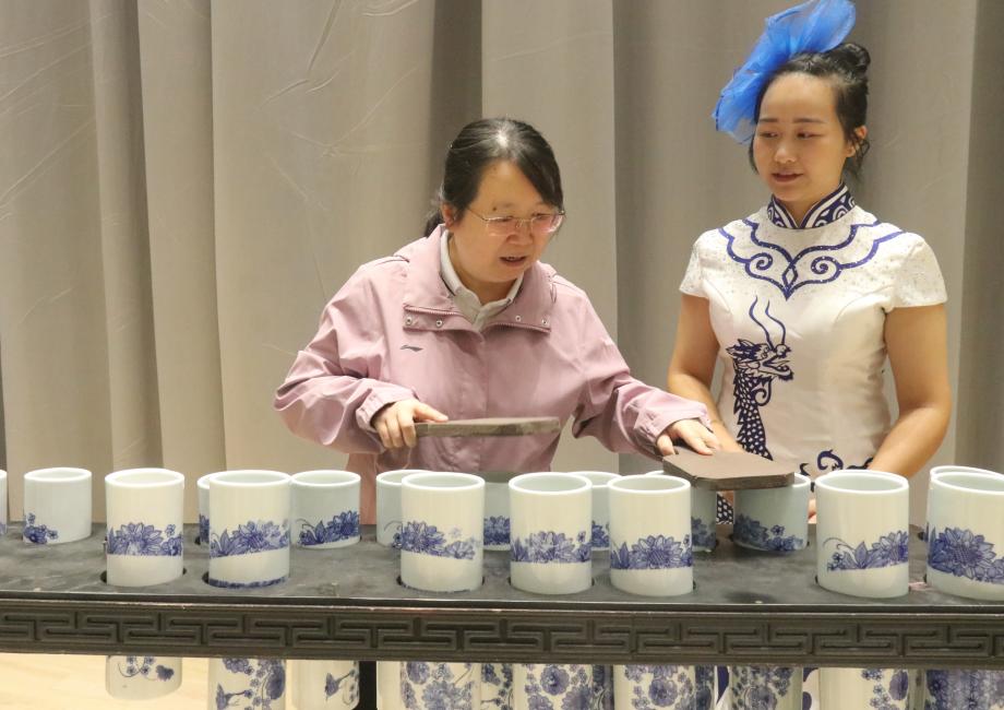 演奏结束以后,调研组成员纷纷上台体验,感受陶瓷与音乐的碰撞。