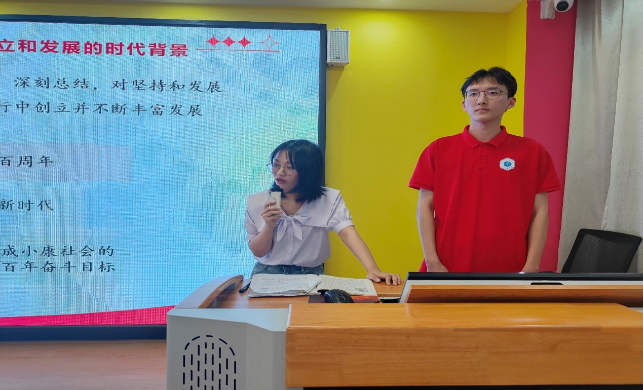 教师蒋芬从习近平新时代中国特色社会主义思想创立和发展的时代背景出发,分析当今世界百年未有之大变局与中华民族伟大复兴战略全局,指出习近平新时代中国特色社会主义思想是中国共产党不断推进实践和理论创新的伟大成果。学生骆逢飘带领大家回顾了新时代十年的非凡历程与伟大变革、伟大成就,并以当代大学生的身份呼吁同学们要将自身发展融入国家发展进程中。随后,同台师生与邱如萍、邱露等同学针对“中国特色社会主义进入新时代”的‘新’体现在哪里?”“‘习近平新时代中国特色社会主义思想开辟马克思主义中国化时代化新境界’中的‘时代化’如何理解?”等问题进行了深入的交流探讨。