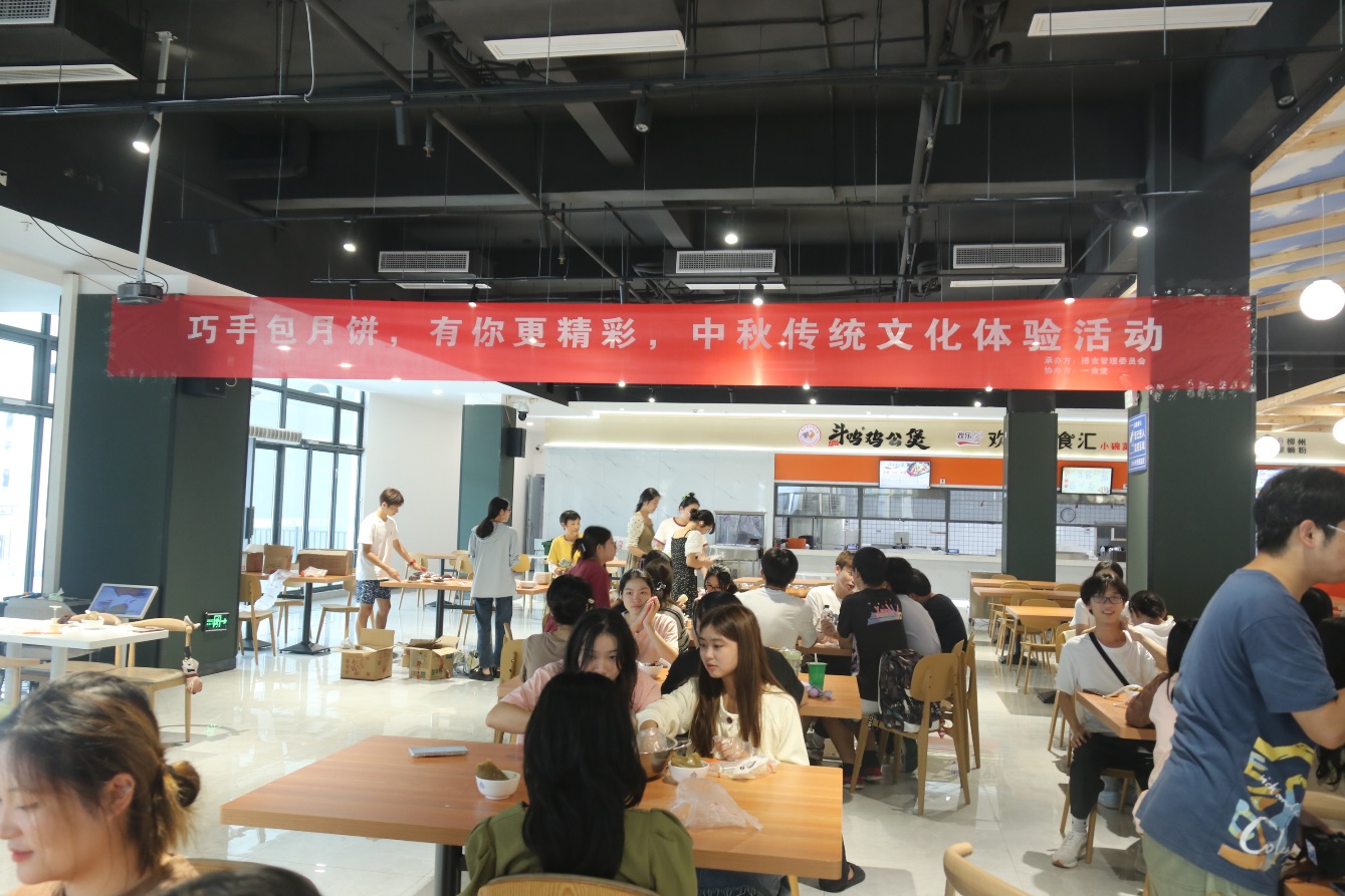 在活动现场,食堂工作人员准备好了制作月饼的所需材料,膳食管理委员会的成员协助分发给参与活动的同学。同学们拿到材料后迅速上手进行制作。虽然很多同学是第一次制作,但大家按照步骤说明一步步仔细地完成,每个步骤有条不紊,做的月饼一个比一个好看,现场气氛融洽,热闹非凡。