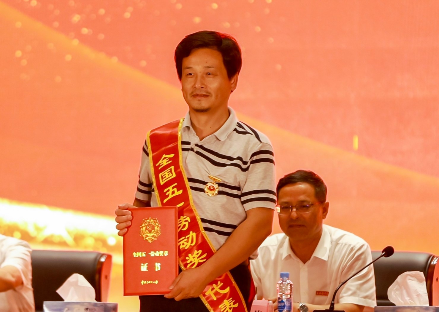 全国五一劳动奖章获得者上台领奖 校报记者江珍燕摄