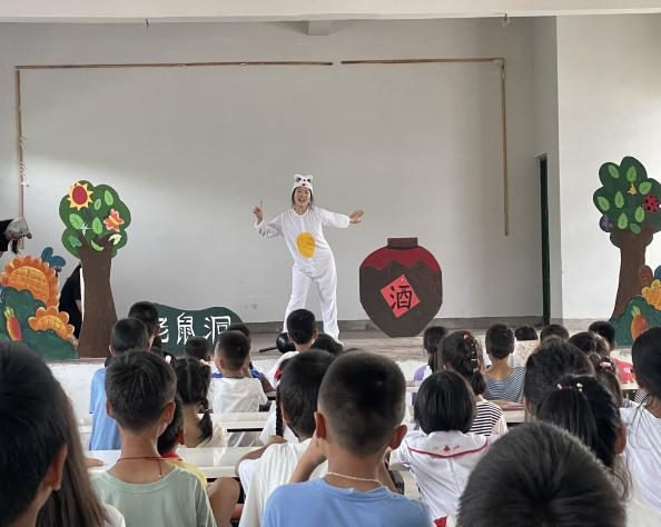 “剧”在一起,携手“童”行实践团队围绕“讲述红色绘本故事,提升儿童爱国心”“扮演绘本角色,丰富儿童想象力”“捏制不织布,提高儿童动手能力”“制作传统手工剪纸,加强儿童合作能力”四个方面,让乡村的孩子们拥有更加丰富多彩的文化学习体验。团队成员们通过演绎绘本情景剧《猫鼠之夜》,让乡村学校的孩子们对绘本情景剧的情感表达形式有了一次近距离的深刻感受,也为孩子们提供了一个有趣的展示知识与学习乐趣的平台。