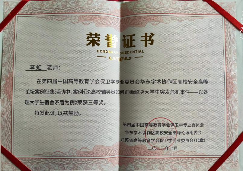 (本网讯:李虹)近日,第四届中国高教学会保卫学专业委员会华东学术协作区高校安全高峰论坛在苏州举行,论坛上评选了各高校选送的保卫工作优秀案例,米兰李虹老师荣获优秀案例三等奖。