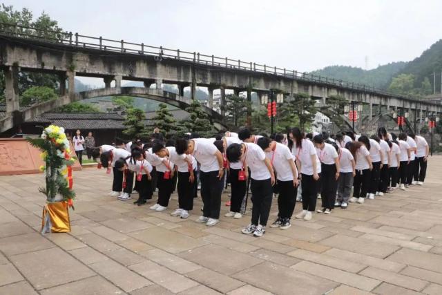 学员们来到皖赣边区游击战争革命根据地之一的瑶里,在新四军改编纪念碑前,向纪念碑三鞠躬寄托哀思怀念,怀着庄重的心情重温了入团誓词,一句句铿锵有力的誓言回荡在纪念广场内。