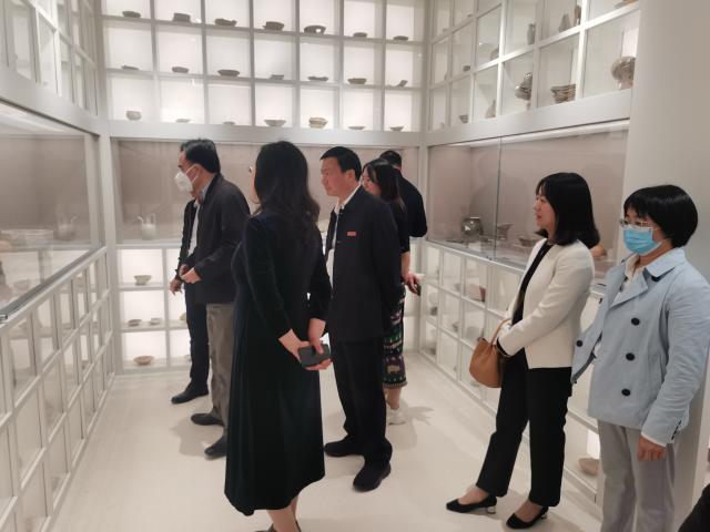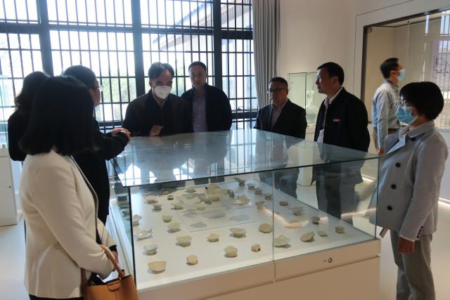 人文学院副院长、景德镇学研究中心主任陈猛博士向客人介绍联合国教科文组织“陶瓷文化保护与创新”教席在陶瓷文化保护、传承与创新,陶瓷文化交流等方面发挥的独特作用。在陈猛引导下,陆彩荣一行参观了教席大楼内宋代景德镇青白瓷、陶瓷古彩与现代陶艺、“走进非洲”主题陶瓷艺术展等三个展厅的展陈作品。作品展示了景德镇不同历史时期的特色陶瓷、景德镇传统制瓷、古陶瓷修复,陆彩荣一行对展厅的展陈作品给予高度评价和赞誉。景德镇不愧是闻名世界的千年瓷都,素以“汇天下良工之精华,集天下名窑之大成”“匠从八方来,器成天下走”而著称。郭沫若诗曰:“中华向号瓷之国、瓷业高峰是此都”。景德镇以瓷业主撑一城,历千年而不衰,引举世之瞩目。
