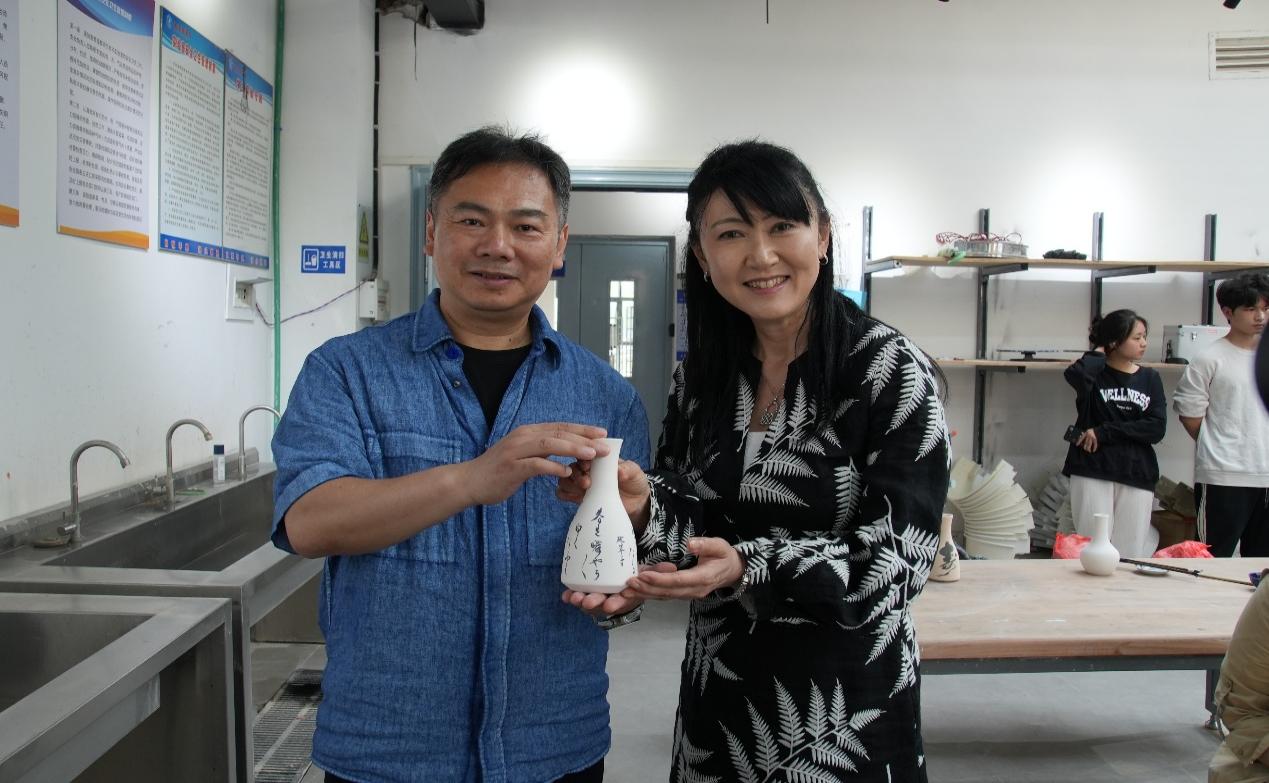 交流团成员展示绘制的陶瓶 校融媒体中心记者胥晴摄
