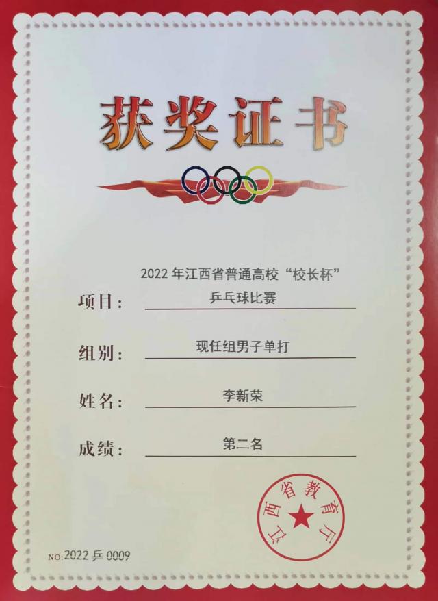 (本网讯:余洪权)9月6日在婺源县进行的2022年江西省高校“校长杯”乒乓球比赛中,校党委委员、纪委书记李新荣,荣获男子单打第二名的好成绩,为学校争得了荣誉。