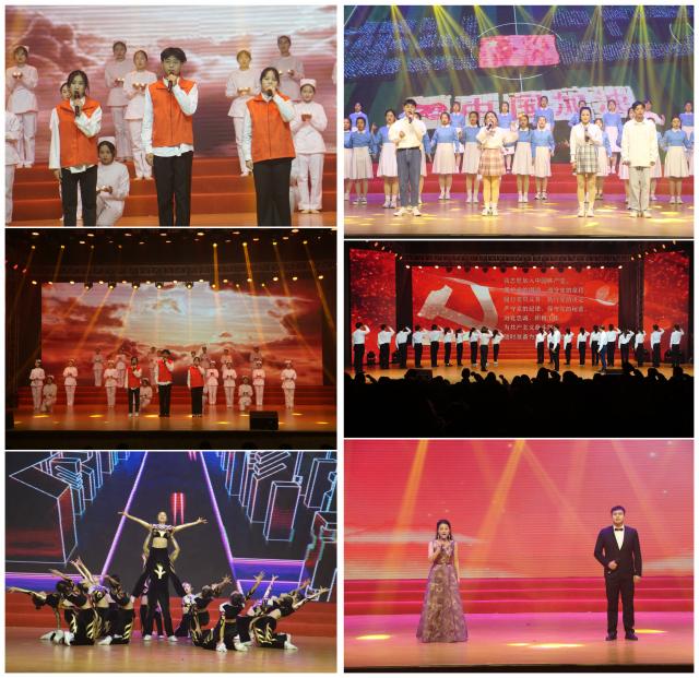 红色舞台上,激动人心的朗诵,雄浑悠扬的歌曲,生动感人的情景剧……把党带领中国人民赓续梦想,接续奋斗的故事娓娓道来,师生重温红色经典,回顾党百年的波澜壮阔,领悟党为民谋福的初心使命。《唱支山歌给党听》《八子参军》《七律长征》《突破封锁线》《不朽的军魂》《我是共产党员,我没有忘记》《飞得更高》《强国有我》《抗疫逆行者》《你们的背影》《奉献》《青春中国》《功勋》《破晓的曙光》《保卫黄河》……演员将红心向党融入恢宏嘹亮的歌声中,将伟大建党精神融入饱含深情的演绎中,将对祖国的热爱和对党坚定的信念,对未来的憧憬和希望融入铮铮誓言中,一个个震撼人心的革命故事,一段段可歌可泣的英雄传奇,一词一韵饱含深情,一字一句铿锵有力,时而慷慨激昂,时而潸然泪下。台下观众置身历史,穿越时空,接受一场思想洗礼的饕餮盛宴,在沉浸式的体验中领悟中华民族从站起来到富起来到强起来的伟大飞跃,现场几度哽咽,掌声不断。