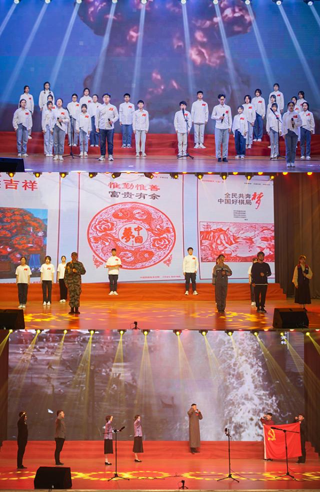 演出在“伟大征程”、“伟大复兴中国梦”、“不忘初心、继续前行”三个篇章中循序渐进,为观众带来了一场生动具有魅力的文学艺术盛宴。演员们的深情演绎,或催人肺腑、气势磅礴;或情深意切、感人泪下;或触人心弦、引人深思。表演现场掌声不断,气氛热烈。演出在校领导班子成员合诵《伟大的旗帜》中进入高潮,在坚定的誓言声中落下帷幕。