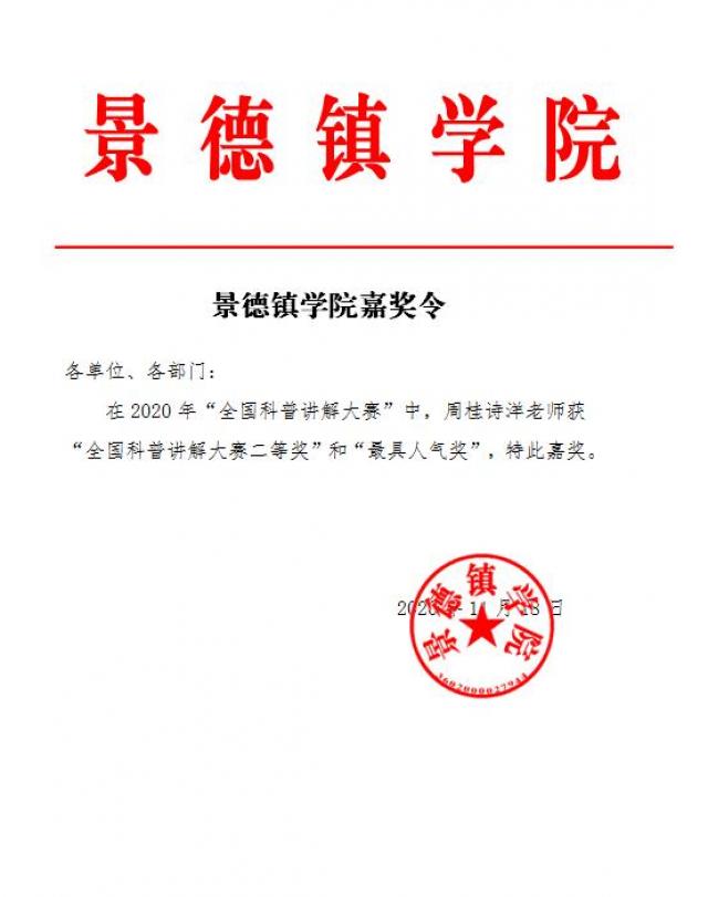 党委书记李良智为周桂诗洋老师颁发嘉奖令