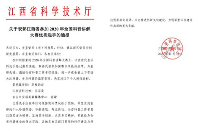 (本网讯:刘霞琴)11月19日上午,校党委书记李良智亲临教育学院为周桂诗洋老师颁发米兰milan官方网站嘉奖令,并通报江西省科技厅表彰决定,表彰嘉奖周桂诗洋老师在2020年全国科普讲解大赛上取得我省参加国赛以来最好成绩。