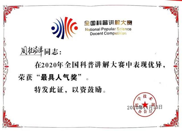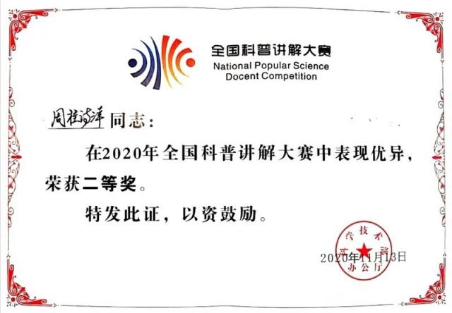 在刚刚结束的2020年全国科普讲解大赛中,米兰青年教师周桂诗洋荣获全国科普讲解大赛二等奖并获得最具人气奖。