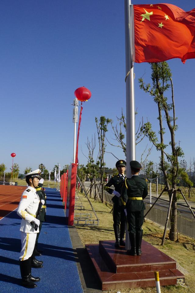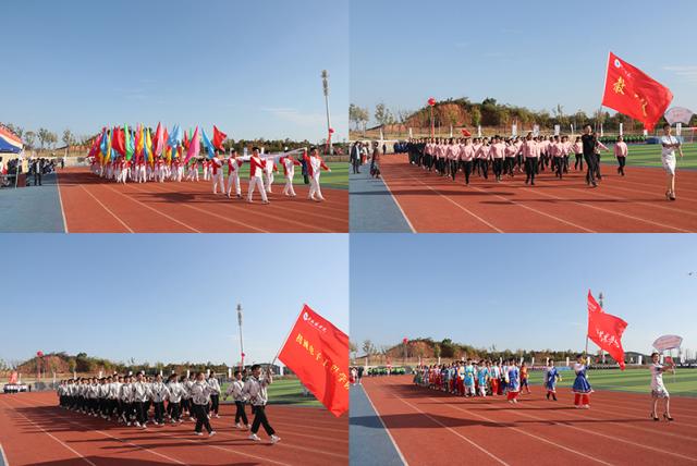 伴随着激昂的《运动员进行曲》,国旗队、会徽队、校旗队、彩旗队、裁判员队、教职工代表队以及各学院代表队,共14支方阵迈着整齐的步伐、喊着响亮的口号依次经过主席台接受检阅,秋末的朝阳照在他们身上,熠熠生辉。