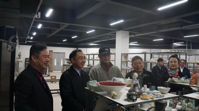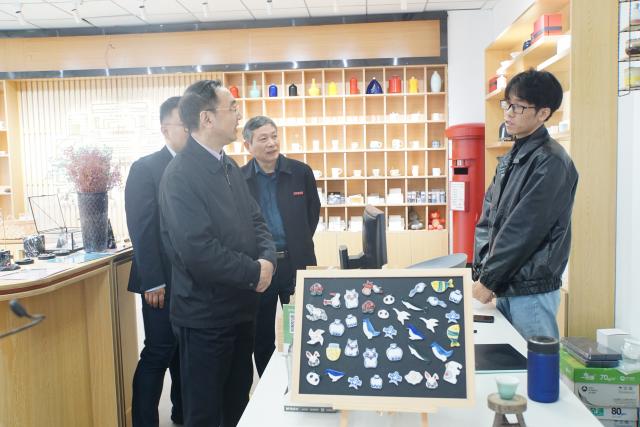 叶仁荪一行参观了艺术学院师生作品展厅和实践基地、创新创业学院、马克思主义学院红色教育基地等。在艺术学院,叶仁荪详细了解了新型陶瓷制作工艺和陶瓷烧制流程,对学校服务地方、特色办学表示肯定;在创新创业学院,叶仁荪和团十八大代表、米兰优秀毕业生、鹰眼工作室创始人刘强进行了亲切交谈,他详细询问了工作室目前员工规模、经营状况以及未来发展规划,对刘强校友依托学校孵化基地取得创业成功表示赞赏,希望他克服疫情影响,行稳致远,把企业越办越好,更多吸纳毕业生就业;当叶仁荪了解到景院文创APP上线,产品线上线下销售两旺,他鼓励创业学生再接再厉,做出更好、取得更大业绩;在马克思主义学院,叶仁荪参观了瓷工运动展室、方志敏和红十军精神展室,瑶里改编展室,对学校结合区域红色文化,传承红色基因表示肯定,对学生实践讲解、创新思政教学实践方式给予肯定。