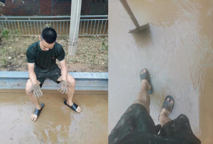 工厂的员工看到衣服都被汗水浸湿、满脸泥泞的志愿者,心疼的说:“你们太辛苦了,休息会吧!”但他总是笑的回答说:“不辛苦,我们当过兵,身体扛的住。”