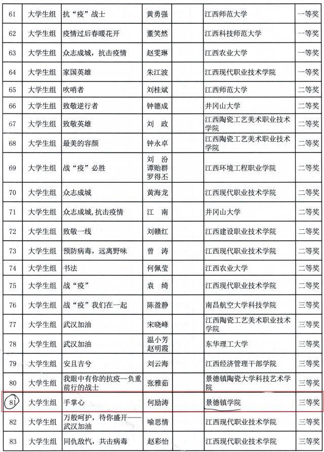 (本网讯:汪万鹏)6月8日,省委教育工委、省教育厅下发《关于公布战“疫”主题征文活动获奖名单的通知》文件,米兰选送的作品《坚守学生“责任田”,勇做防控“抗疫人”》作者:李婷婷(教育学院教师)荣获干部教师组文章类二等奖;《手掌心》作者:何励涛(艺术学院学生)荣获大学生组绘画类三等奖;《我的疫情生活》作者:郭雅琴(艺术学院学生)荣获大学生组绘画类三等奖。