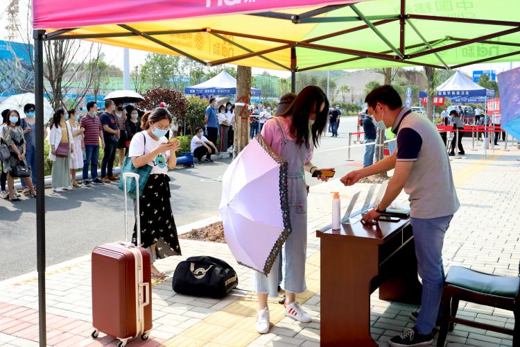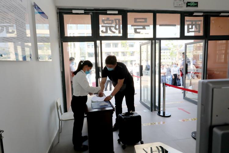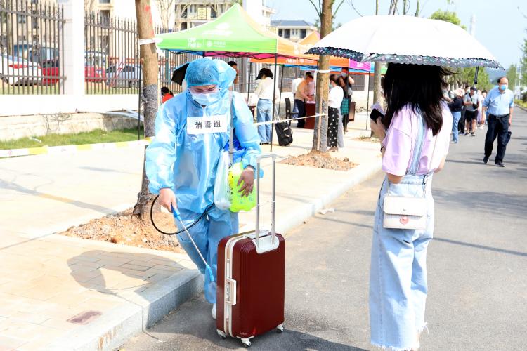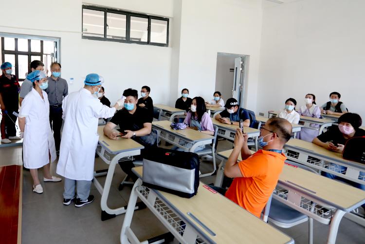 下午15时,随着郑昕芾的一声令下,演练正式开始。从学生按照报到流程进入校西门开始,依次按学生进校、进宿舍楼、进学生食堂、进教室的流程进行演练,参演辅导员以学生身份按照出示证件、验健康码、体温检测、登记、扫通行码、发通行证、行李消杀、进校门和测温刷脸进寝室、食堂、教学楼的流程进行。同时,发现学生在入校时、在寝室、食堂用餐时、在教室晨检时出现发热、咳嗽等疑似症状时,立即疏散周围学生建立安全警戒并第一时间进行层层上报,得到校应急防控工作领导小组命令后,马上引导疑似学生进入临时隔离观察点进行复测,对依然出现异常的学生,立刻拨打浮梁县疾控中心电话等待救护人员到场,同时安排学生心理健康教育教师通过通讯设备安抚学生情绪和了解学生行程及接触人群等信息,并对密切接触人员启动临时隔离措施。