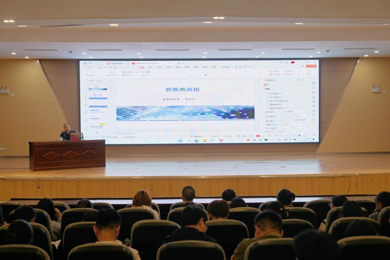 省委政法委反邪教协调处副处长阳志良受邀主讲,他以国内外多个案例为切入点,深刻剖析了邪教的本质与危害,揭示了邪教组织常用的不良手段,详细阐述了校园防范邪教的各项措施,特别强调了增强网络邪教辨别能力的重要性,为师生们提供了实用的防范指南,并告诫大家要树立正确的宗教观念,坚决抵制邪教的侵蚀。