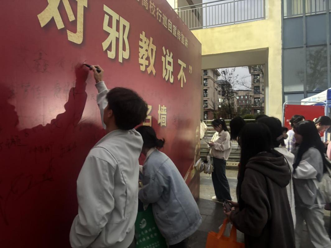 会后,与会人员在第一食堂外树立的“对邪教说不”签名墙上签名,表达自己对反邪教斗争的坚定立场和决心,并参观了反邪教宣传展览,通过丰富的图文资料和实物展示,进一步加深了对邪教危害的认识和理解。