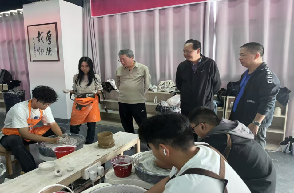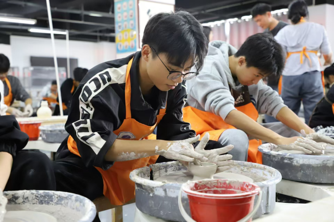 讲座结束后,同学们开启了陶艺实践环节。指导老师余辉和陈梦珂带领大家在陶艺工作室进行拉坯体验,让同学们在亲身实践中体会陶艺技艺的精妙与创作的艰辛,同时也感受到了匠心独运的深远意义。