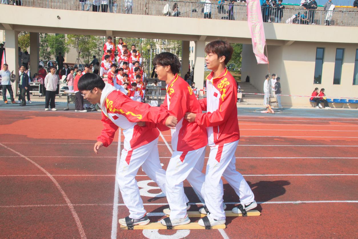 当日正是霜降节气,操场上寒风凛冽,但阻挡不了选手们的参赛热情。在发令枪响起的瞬间,运动员们斗志昂扬,三人一组,脚绑特制木板鞋,心往一处想,劲往一处使,向终点奋力冲刺。伴随着“一二一”“左右左右”的整齐口令声,整个赛场被紧张而激烈的氛围所笼罩。三人成组、目标明确、团结一致的竞赛方式,让在场的每一个人都感受到了团队力量的魅力。