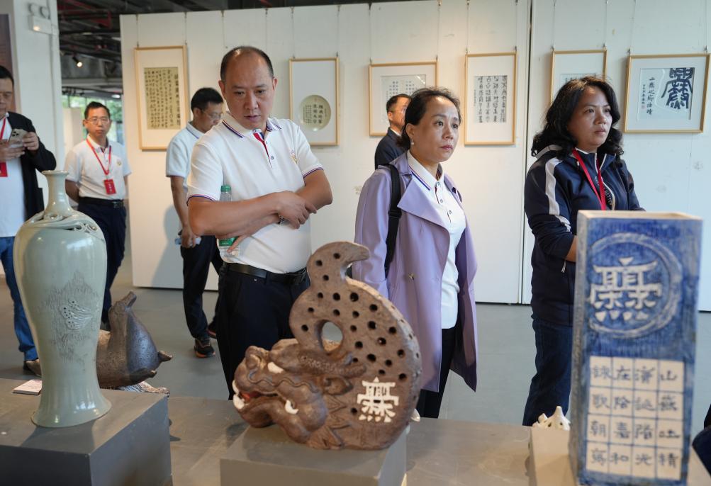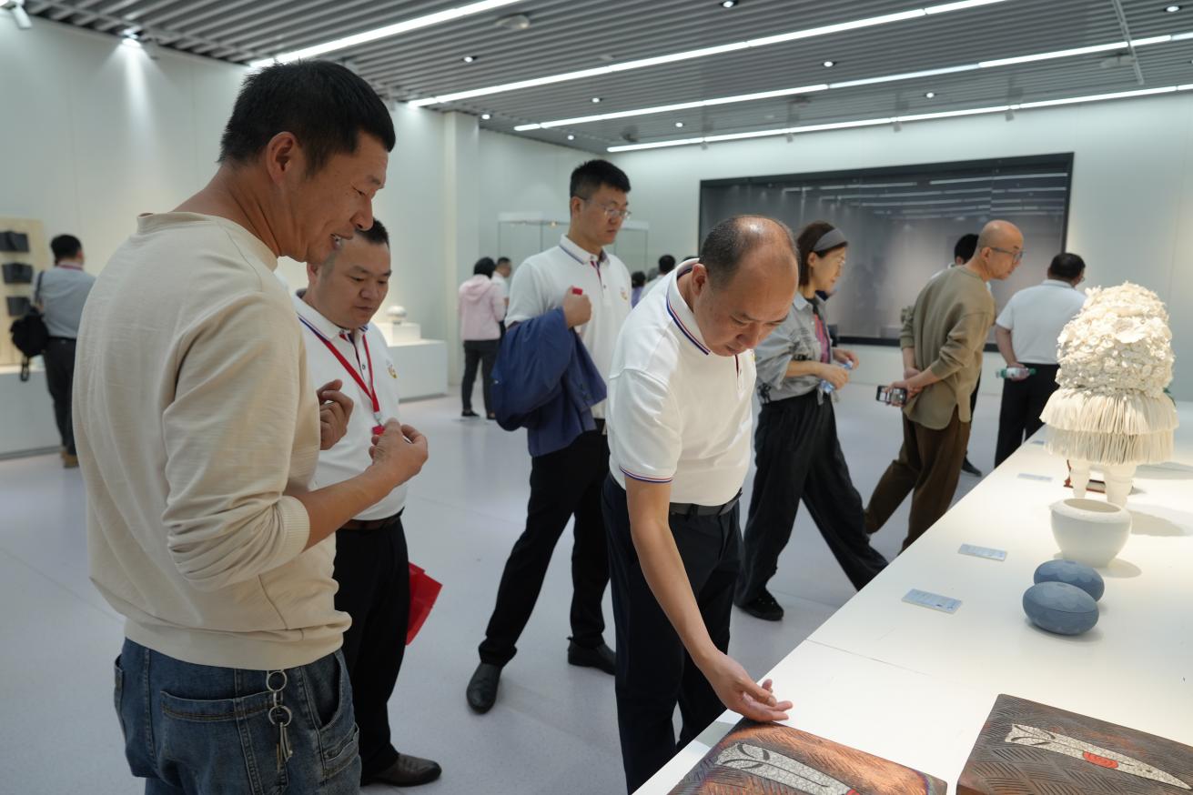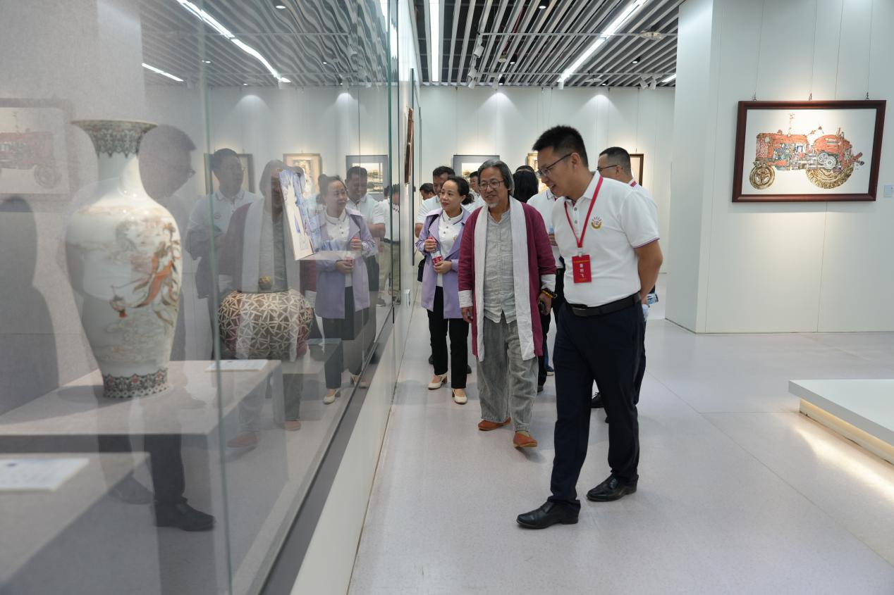 在艺术学院,培训班成员参观了师生实践作品展。展览作品涵盖了陶艺、绘画、书法、雕塑、设计等多个领域,充分展示了艺术学院师生的创作才华和艺术追求。艺术学院党委书记陈后辉、院长张博陪同参观,并向来访客人详细介绍了学院在实践教学方面的成果和特色。