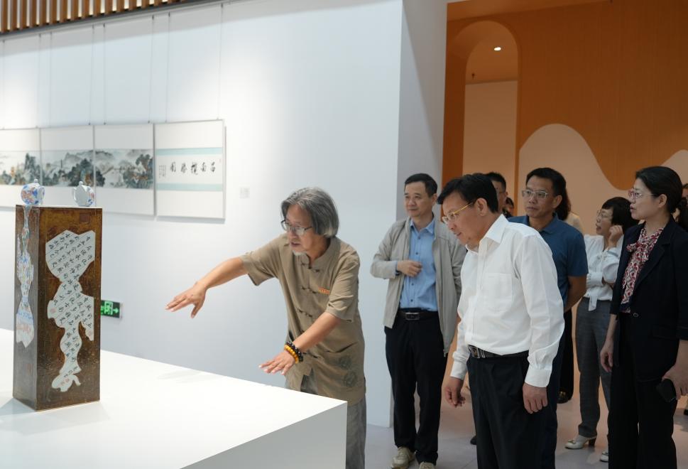 随后,调研组一行前往校美术馆参观,美术馆馆长郑丰银向来访客人们详细介绍了美术馆的藏品及展览亮点。馆内展品将传统艺术与现代技术巧妙融合,生动展现了景德镇陶瓷文化的深厚底蕴与独特风貌,为调研组提供了一场艺术视觉与陶瓷文化的双重盛宴。