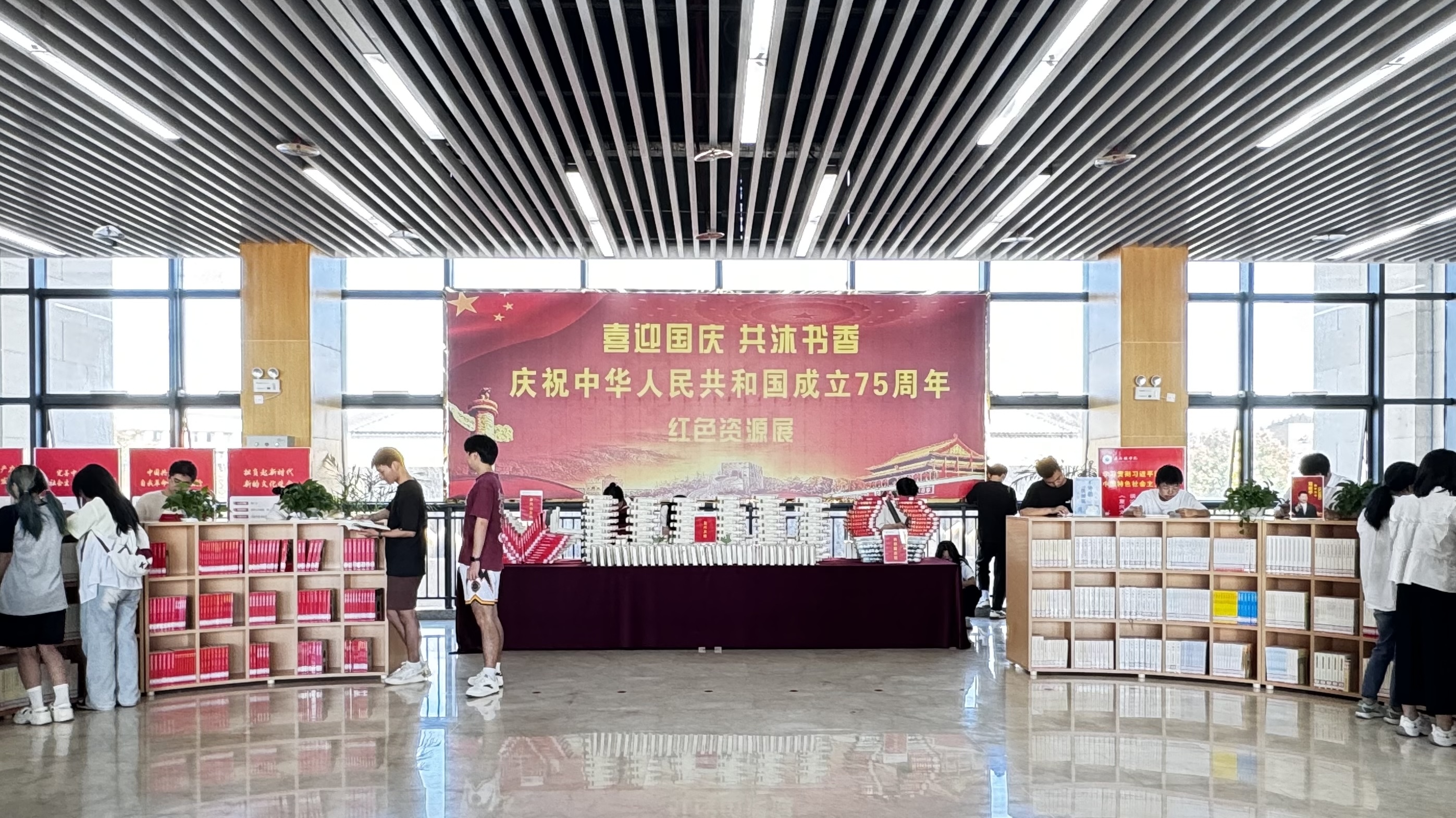 此次“喜迎国庆共沐书香”红色资源展,不仅是向祖国母亲75周年华诞的深情献礼,更是一次红色文化的传承和弘扬。此次活动在图书馆二楼大厅举行,吸引更多的读者走进图书馆,感受红色经典带来的精神力量,更加坚定爱党爱国的理想信念,以扎实的本领投身强国建设和民族复兴伟业!