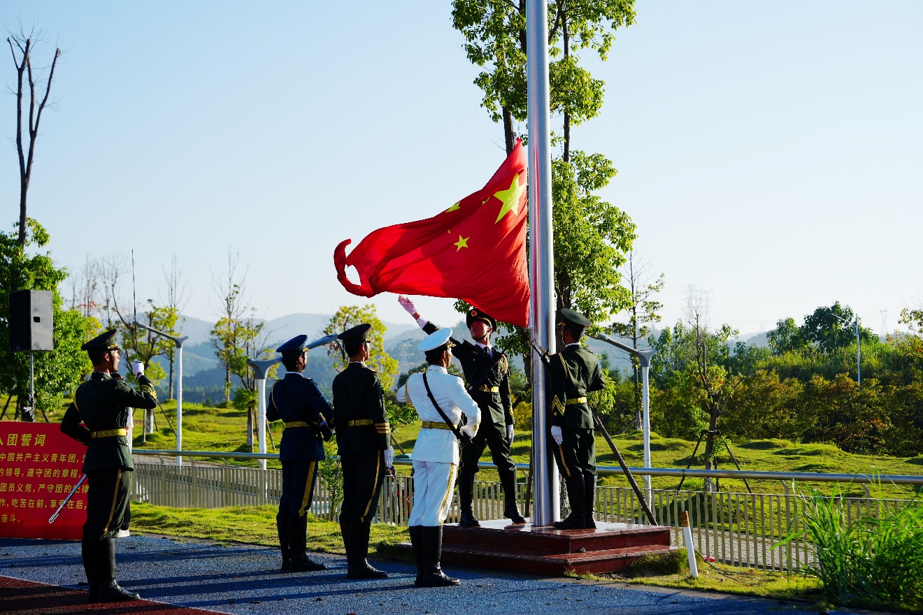 晨曦初照,国旗护卫队以雄浑之姿,踏着坚定铿锵的步伐,护送鲜艳的五星红旗步入会场。国歌响起,五星红旗在朝霞中冉冉升起,与旭日共舞,在场全体人员深怀对祖国无限的热爱和崇高的敬意,肃立齐唱国歌。