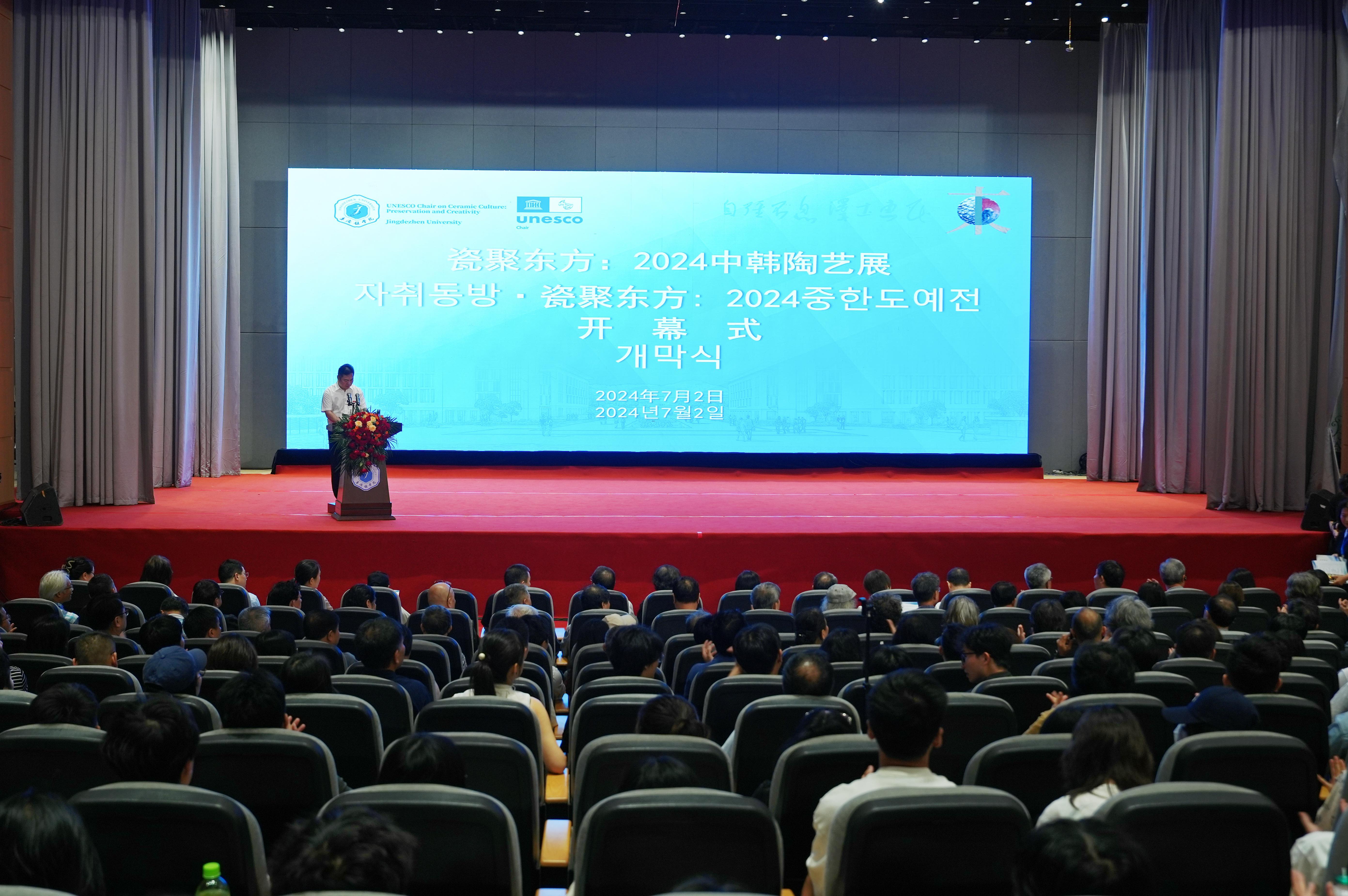 校党委书记叶观荣宣布“瓷聚东方:2024中韩陶艺展”开幕,校党委副书记、校长熊震宇,副校长黄志坚出席,党委委员、副校长方漫主持开幕式。