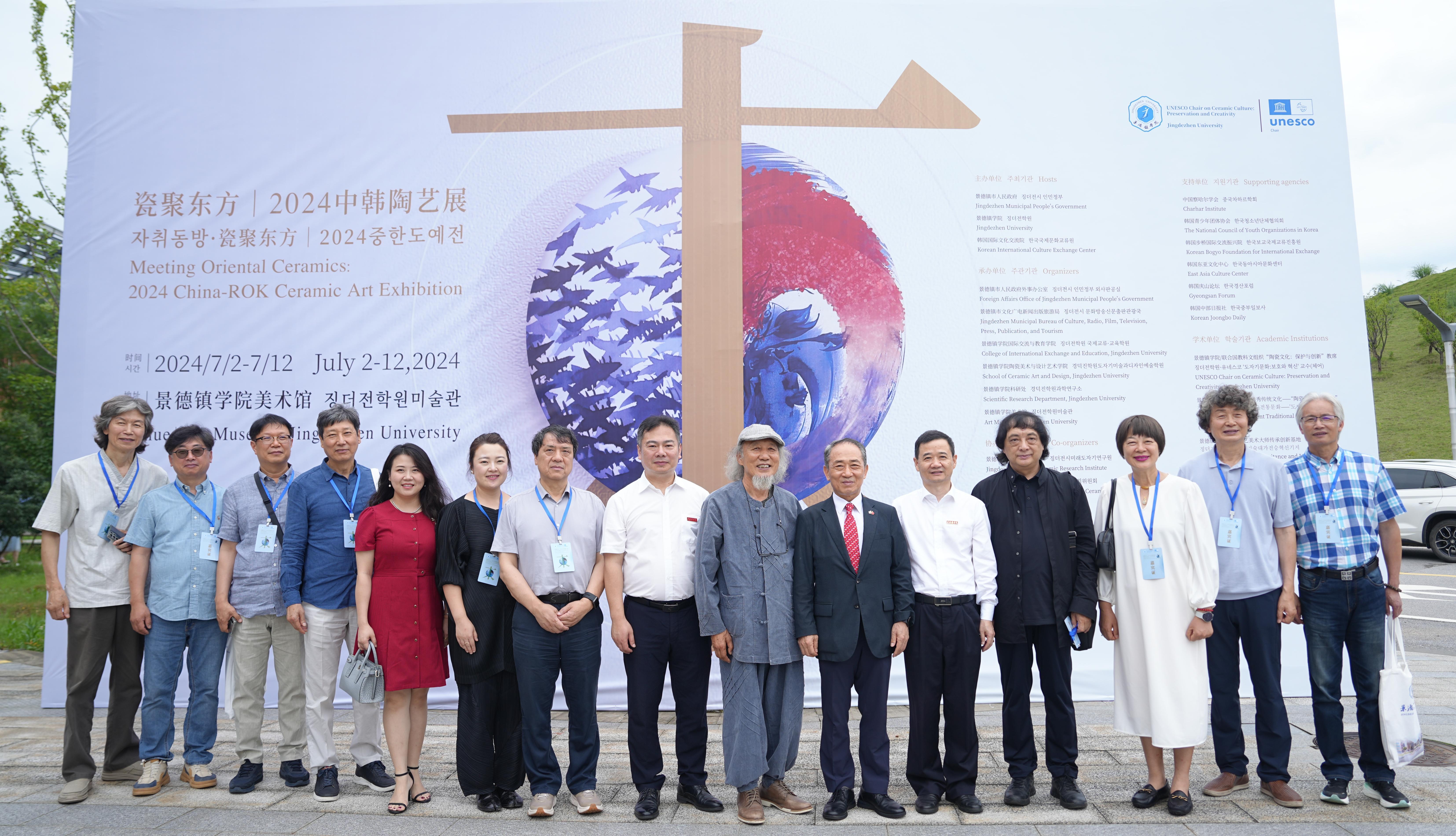 韩国驻武汉总领事馆总领事河成柱及夫人李彩庆,韩国国际文化交流院院长宋基出,韩国东亚文化中心院长卢载宪,延世察哈尔研究所所长张忠义,ESGKOREA京畿网络代表、前水原市副市长刘文钟,韩国步桥国际交流振兴院院长孙寿翼,韩国陶艺家协会理事长尹泰云,景德镇市委常委、副市长崔素香,江西省教育厅国际合作与交流处副处长(主持工作)吴佐文,景德镇陶瓷大学原校长、教育部设计学类专业指导委员会副主任、中国陶瓷艺术大师宁钢,景德镇市美术家协会主席、景德镇陶瓷大学原副校长吕金泉,江西省文联副主席、景德镇陶瓷大学校党委委员、统战部部长陈丽萍,景德镇市文旅局党组书记、局长盛璟晶,景德镇陶瓷文化国际交流中心主任江霞,景德镇市外办副主任冯志红等嘉宾出席开幕式。