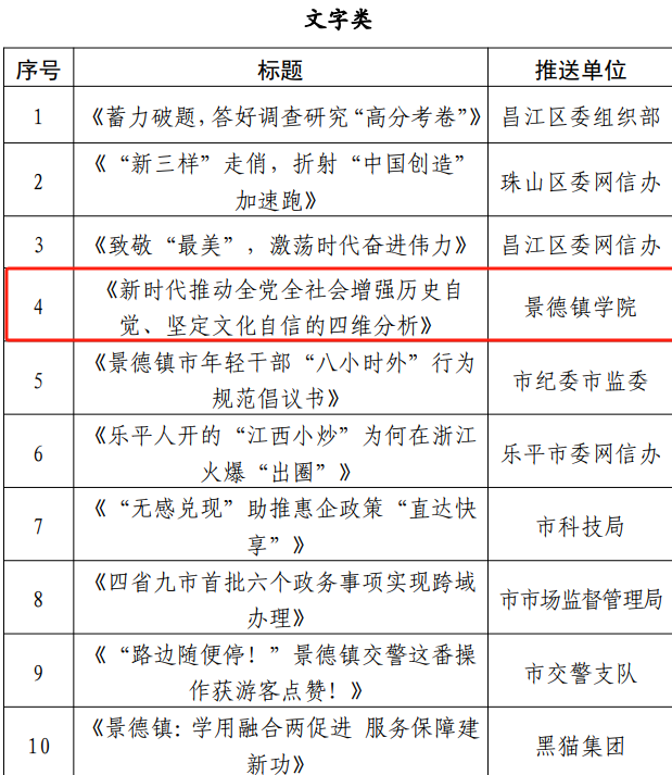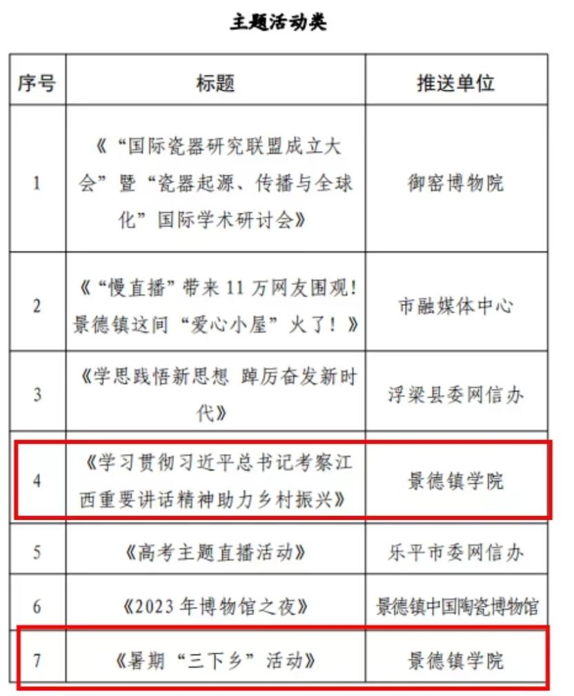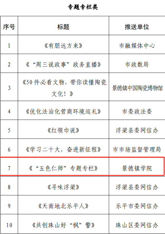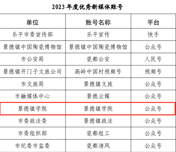 经推荐初评、专家评审,在2023年度景德镇市瓷都正能量“五个十”网络精品评选活动中,米兰推送的马克思主义学院作品《新时代推动全党全社会增强历史自觉 坚定文化自信的四维分析》、音乐舞蹈学院作品《瓷乐:四首民歌联奏》、教育学院专栏《“五色仁师”专题专栏》,校党委宣传部《学习贯彻习近平总书记考察江西重要讲话精神助力乡村振兴》和校团委的《暑期“三下乡”活动》分别在文字类、音视频类专题、专栏类和主题活动类被评为网络精品;在景德镇市瓷都网络宣传“四个十佳”先进个人(账号)评选活动中,米兰“米兰milan官方网站”微信公众号荣获景德镇市“优秀新媒体账号”,党委宣传部融媒体中心主任李婷婷获景德镇市“优秀新媒体工作者”称号。
