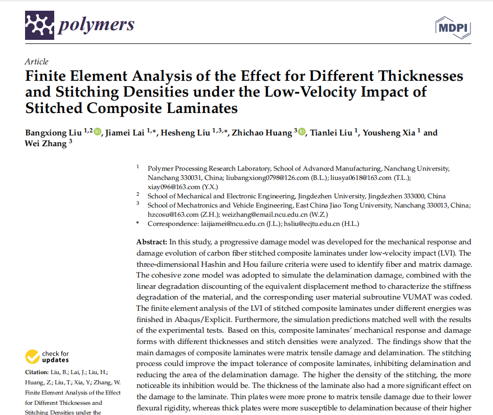 以第一作者身份在复合材料领域期刊《Polymers》(中文译名《聚合物》)上前后发表了题为“Finiteelementanalysis of theeffect fordifferentthicknessesandstitchingdensities under thelow-velocityimpactofstitchedcompositelaminates”(“缝合复合材料层合板低速边缘冲击及冲击后压缩的实验与数值分析”)的最新科研成果。