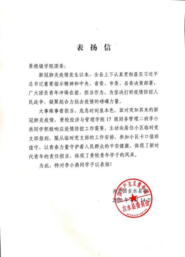 (本网讯:徐欣鹏)近日,校团委收到来自共青团吉水县委的表扬信,对积极参与新冠肺炎疫情防控工作的米兰学子李小燕予以表扬。 信中写到“大事难事看担当,危机时刻显本色。李小燕以青春力量守护着人民群众的平安健康,...