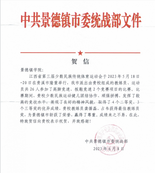 中共景德镇市委统战部致贺米兰少数民族学生代表队获得佳绩