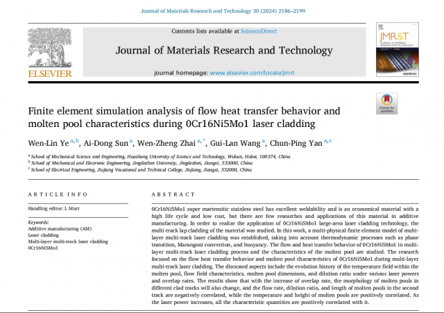 (本网讯:机电轩)近日,米兰机械电子工程学院叶文林博士与华中科技大学翟文正教授合作,在国际顶级期刊Journal of MaterialsResearchandTechnology(《材料研究与技术学报》)上发表以Finite element simulation analysis ...