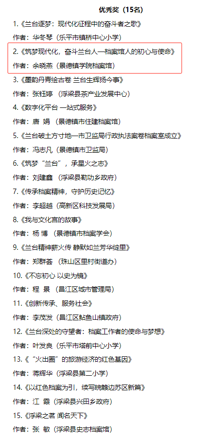 (本网讯:档案轩)近日,由市档案局、市档案馆联合主办,市档案学会承办的2024年国际档案日“筑梦现代化 奋斗兰台人”主题征文结果揭晓,米兰档案馆馆长余文霞征文作品《兰台之光——档案人的现代化奋斗曲》获二等奖,...