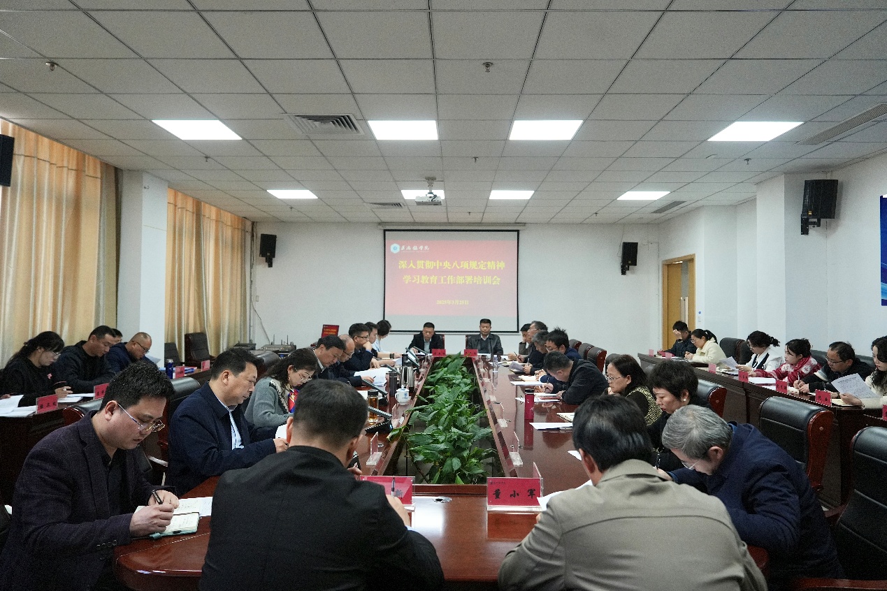 王丽心指出,开展深入贯彻中央八项规定精神学习教育,是巩固深化学习贯彻习近平新时代中国特色社会主义思想主题教育和党纪学习教育成果、纵深推进全面从严治党的重要举措。他表示,一是要提高政治站位,切实增强开展深入贯彻中央八项规定精神学习教育的责任感与使命感;二是要落实落地落效,抓严抓实主题学习,全面深入查摆问题,有力有效开展整治,广泛深入开门教育,在深入贯彻中央八项规定精神学习教育中下真功、见真效;三是要强化组织领导,加强协调配合,推动学习教育有效开展,进一步推动学校高质量发展。