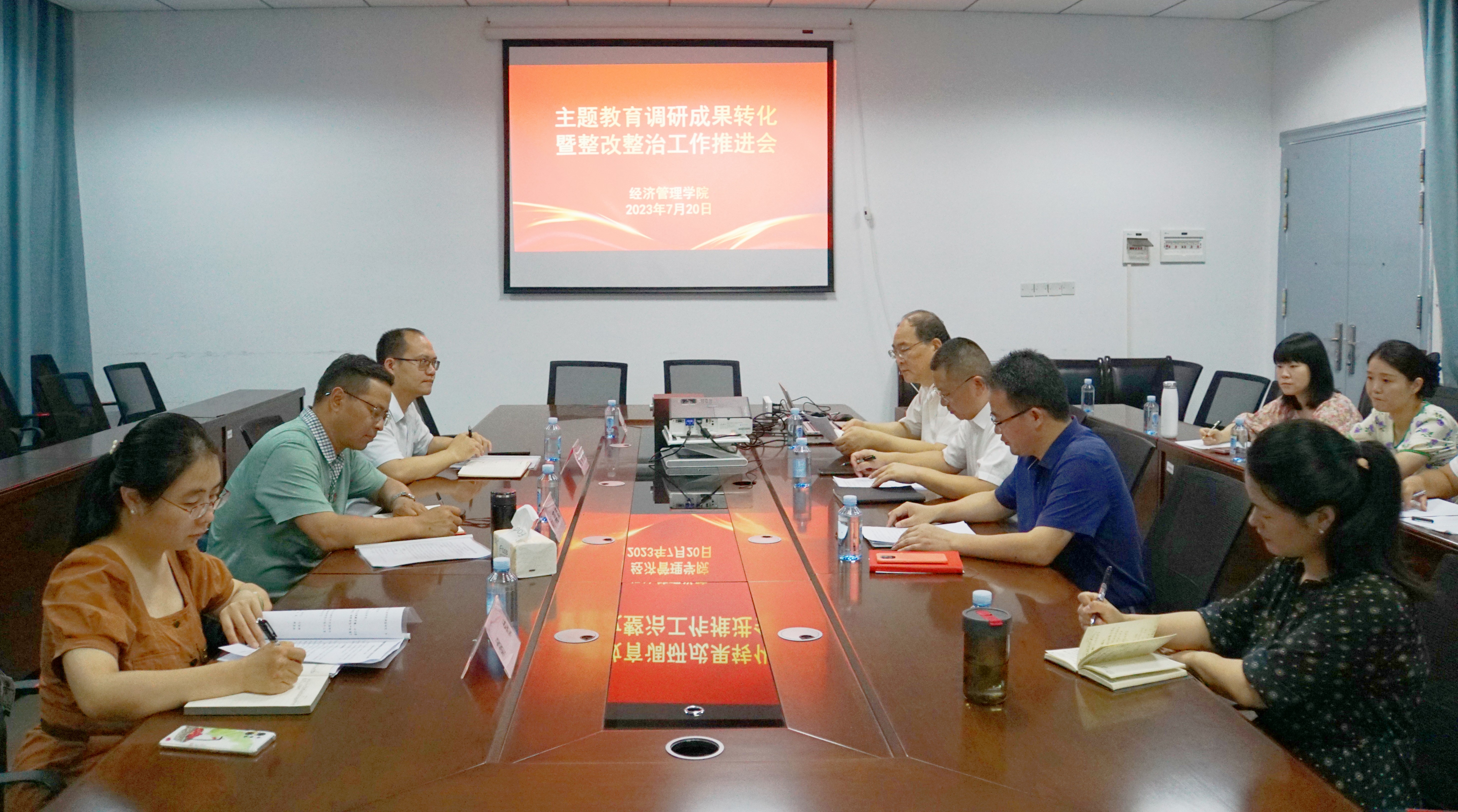 (本网讯:李婷婷)7月20日上午,经济管理学院学习贯彻习近平新时代中国特色社会主义思想主题教育调研成果转化暨整改整治工作推进会在学院会议室召开,校党委书记叶观荣到会指导,经济管理学院党委书记王振华主持会议。